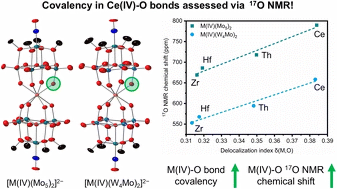 Our collaborators devised a clever synthetic strategy, exploiting the synthetic playground offered by POMs to build a series of “sandwich” complexes with different metal ions: Zr(IV), Hf(IV), Th(IV), and Ce(IV), all having the same exact chemical environment. The isolation of stable, diamagnetic M(IV) complexes allowed them to study this series with ¹⁷O NMR spectroscopy and directly probe the interactions between oxygen atoms and the central metal. By looking at the oxygen chemical shifts, they found that the Ce-O signal was significantly different from the rest, signaling a unique electronic structure.